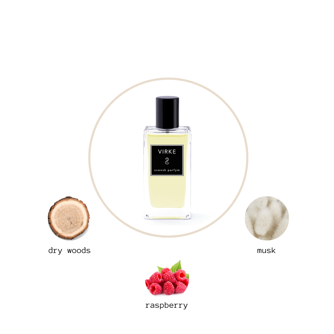 Fruity, fresh aromatic, woody, musky. Virke is based on complex dry woody and musky accords with delicious raspberry lingering in the heart and top.